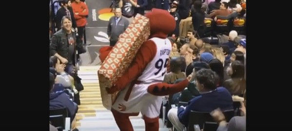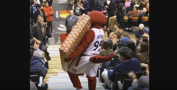 Raptors Mascot Drops Flatscreen TV While Bringing It To A Fan!